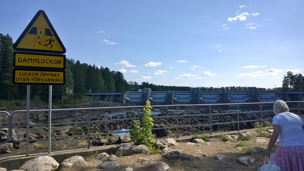 Man kommer mycket nära forsarna och det är rätt bra att lyda skyltarna. Jag antar att dammluckorna styrs automatisk bero-ende på vattenflödet i Dalälven så det kan inte vara hälsosamt att stå mitt i forsen när vattnet släpps på.