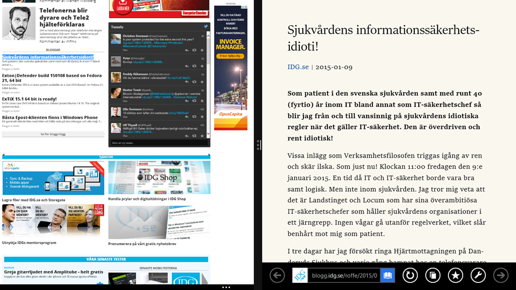 I vilket fall som helst så är min största nyfikenhet stillad. “läsvyn” i Internet Explorer 11 finns med i Windows 8.1 och fungerar hur bra som helst. När man skrollar/bläddrar i texten så sker det sidledes i min Laptop till skillnad mot lodrätt som i min Windows Phone. En smaksak helt enkelt. Det viktigaste är att den finns!