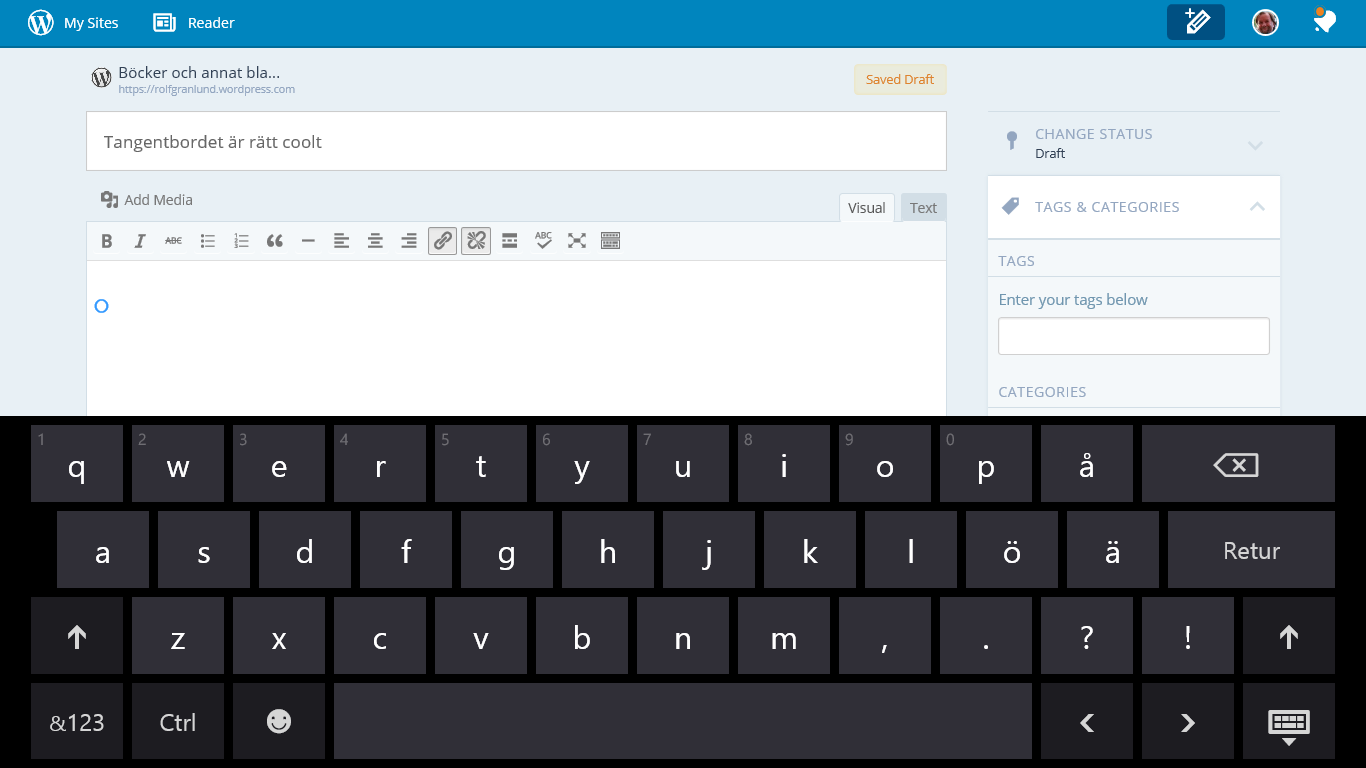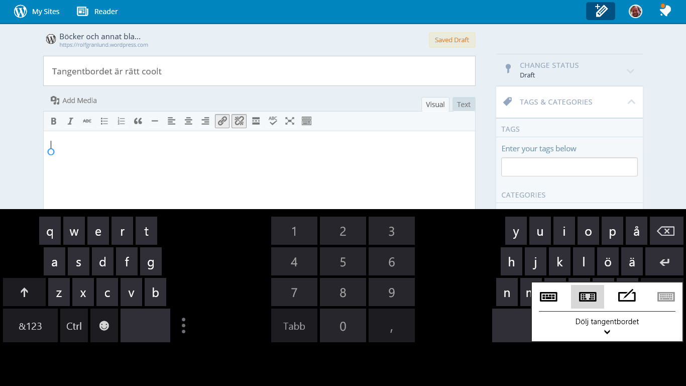 Om man däremot har en mindre pekplatta, 7″-8″ så ändrar man säkert tangentbordet till nedanstående samt håller plattan med båda händerna samt skriver med tummarna.