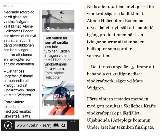 Till vänster visar jag hur en sida presenteras i nyteknik.se med Internet Explorer 11 i Windows Phone 8.1 och bredvid till höger samma sida i Läsvy-version. I den vänstra bilden längst ner ser du en ikon i form av en ”uppslagen liten svart bok”. Det är den som du sätter fingret på för att starta Läsvyn av sidan.