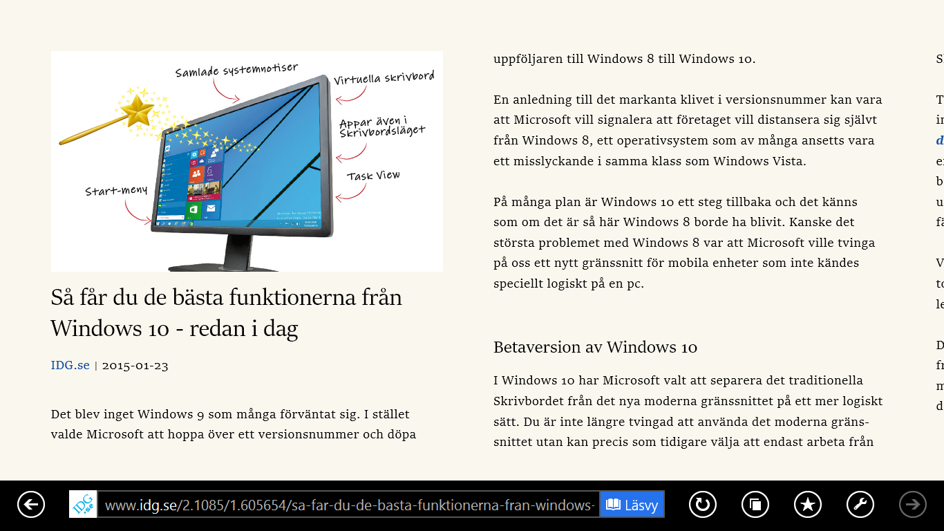 Jag kanske ska understryka att Läsvyn i ovanstående bild är tagen från pekskärmsversionen av Internet Explorer 11. Jag har i skrivande stund inte hittat om Läsvyn i PC-versionen av Internet Explorer 11 existerar överhuvudtaget. De är nämligen lite olika och jag kör ju båda i min lilla åtta tums pekplatta beroende på vad jag avser att göra.