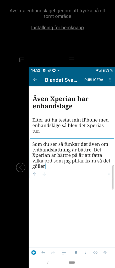 Som du ser så funkar det, även om tvåhandsfattning är bättre. Det Xperian är bättre på är att fatta vilka ord som jag plitar fram, så det gäller (göller blev gäller) att hålla ett öga på de förslag på ord som kommer. Och som sagt var, på det området är Android bättre än iOS.