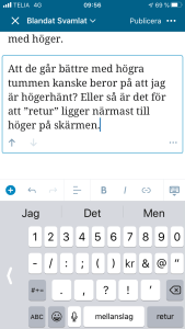 En annan detalj som är bättre i iPhone är att flytta markören genom att trycka och hålla i ”space bar” eller ”mellanslag” som den ju heter på vanlig ren svenska. I Android kan man även flytta markören med tryckningar på skärmen men är lite bökigare helt enkelt. Fördelen med iPhones lösning är att textdelen av skärmen är helt fri och därmed synlig för markörförflyttningen.