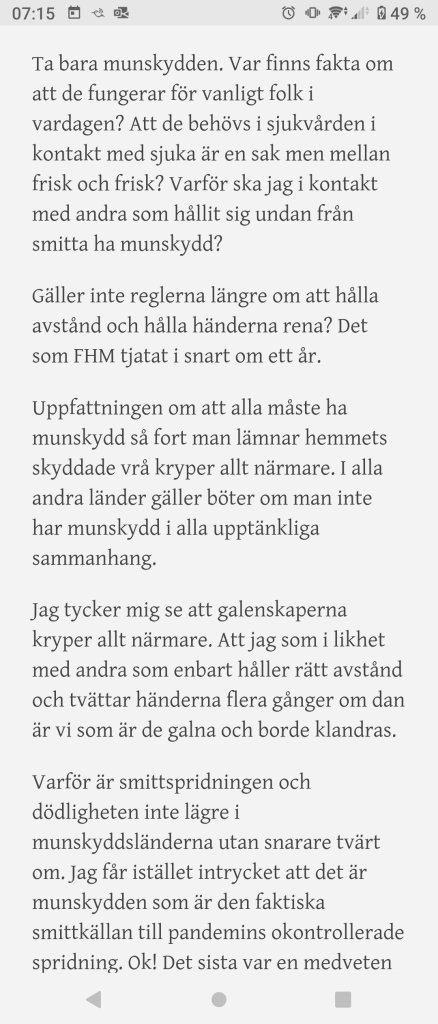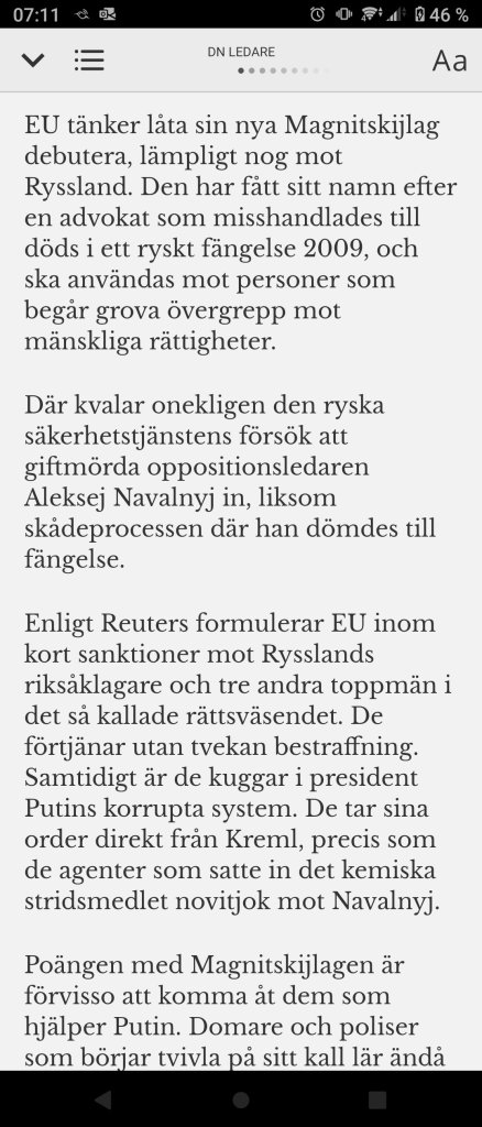 De exempel som följer är skärmbilder på texter från olika appar i min Sony Xperia 10 II som tillhör de längsta avlånga formaten på en smartphone med en 6″s skärm. Formatet på skärmen har relationen 21:9 och är i horisontellt läge samma format som moderna filmer.