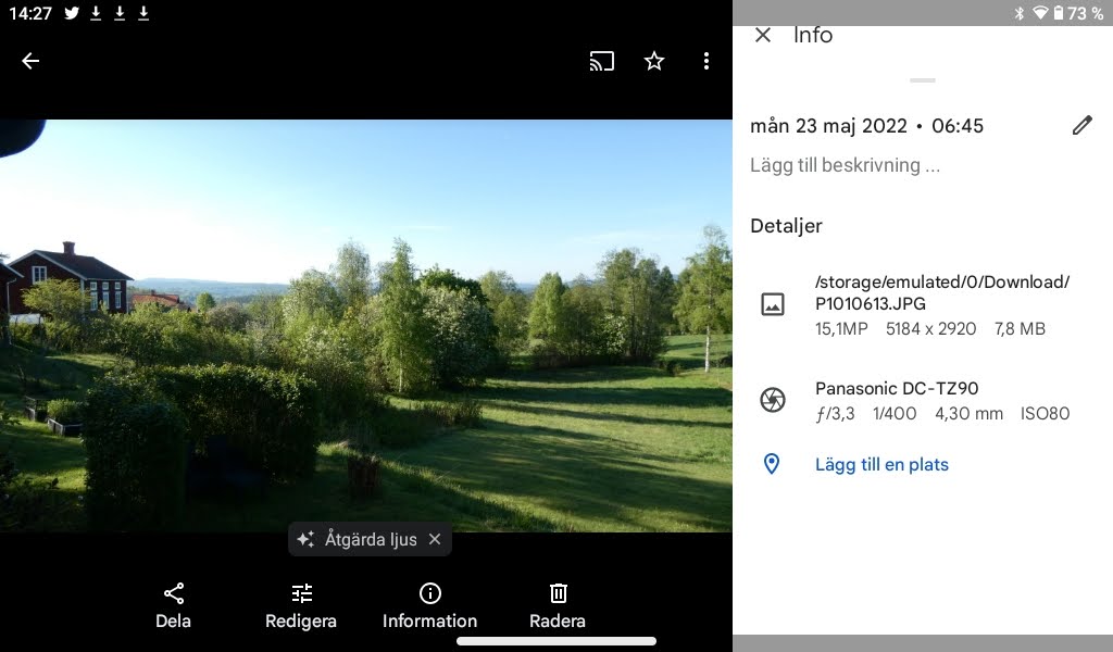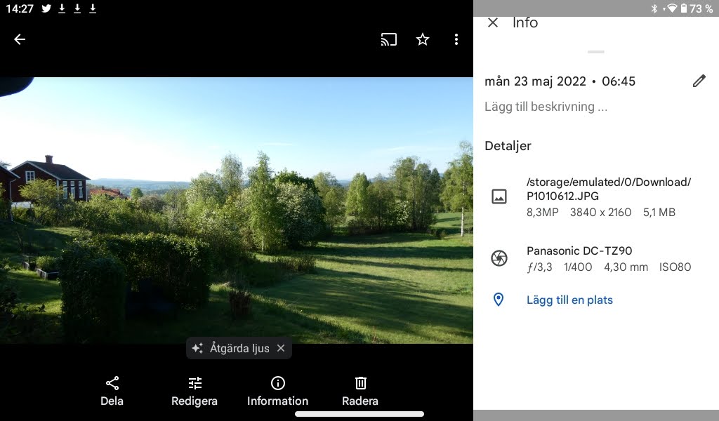 När jag sedan betraktade dessa tre foton i både telefon, sjutums surfplatta samt tiotums surfplatta och zoomade in bilderna så såg jag till min förvåning ingen skillnad. Efter en del googlade efter svar så är min slutsats för närvarande att skärmarna bestämmer upplösning på alla foton, därför ingen skillnad.