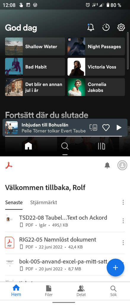 Överst så har jag då Spotify och under mina sång- och ackorddokument som PDF-dokument i Adobe Acrobat Reader