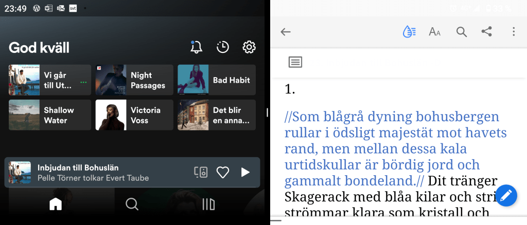 Den stora fördelen är att jag dels kan skrolla i mitt PDF-dokument samtidigt som jag kan stoppa och starta om låten i Spotify när som helst och hur som helst utan att jag behöver stoppa och starta respektive app. Båda apparna är ju redan igång och synliga och påverkbara på den avlånga skärmen.
