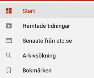 Överst till vänster har du de tre korvarna eller de tre horisontella strecken som tar dig till menyn i ETC. Symbolen, eller ikonen med tre streck är lite av en standard på nätet och omedelbart lätt att förstå. Problemet kan vara att det inte är första stället man letar efter för att se sina sparade artiklar. Men det beror ju på, som sagt var. Många tycker nog att det är en logisk väg.