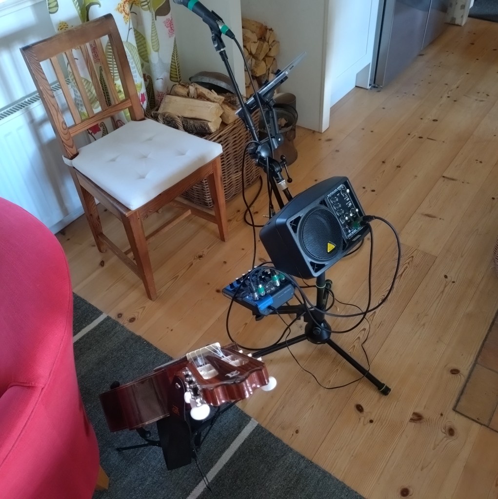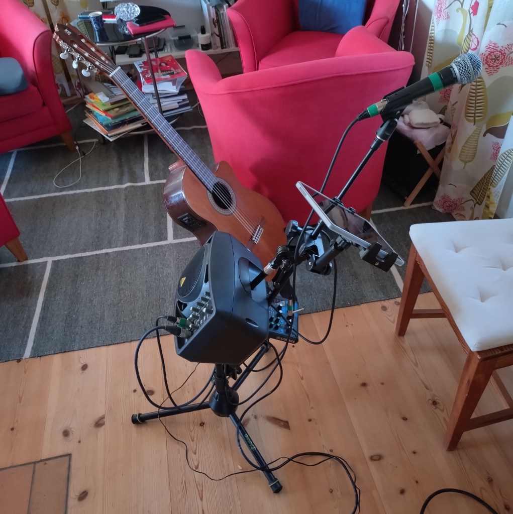 När jag ljudtestat allt, och allt är till belåtenhet så återstår att plocka ner varenda pryl, kabel, pedal, mick och stativ samt gitarr, munspel och surfplatta i lämpliga transportväskor. Men jag avvaktar ett par dagar tills kabelpatcharna från Thomann har anlänt.